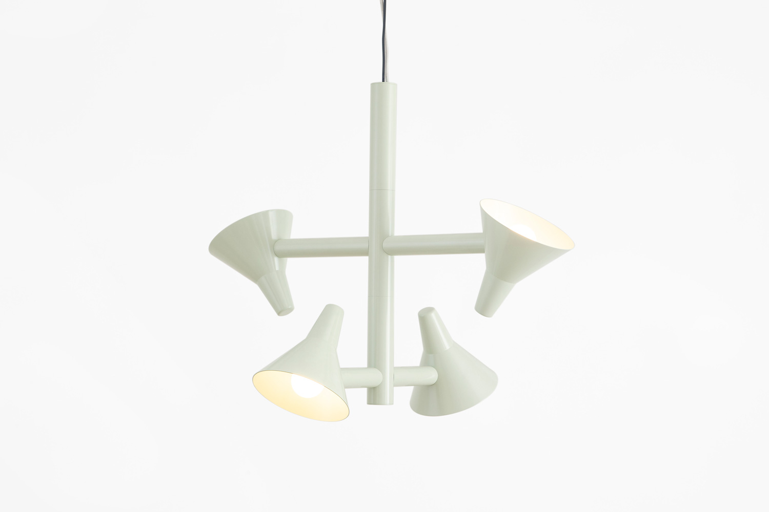 Pendente com 4 refletores em alumínio colorido. Disponível nas cores cinza queimado, branco, preto, verde menta, verde bandeira, nude, verde pastel e iridescente. Cordão de força de tecido branco ou preto. Cordão de força de tecido colorido.