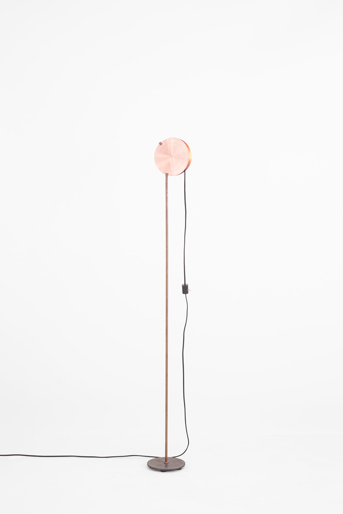 Coluna com refletor de cobre escovado e haste natural, base de ferro bruto, cordão de força de tecido em cores e interruptor especial.
