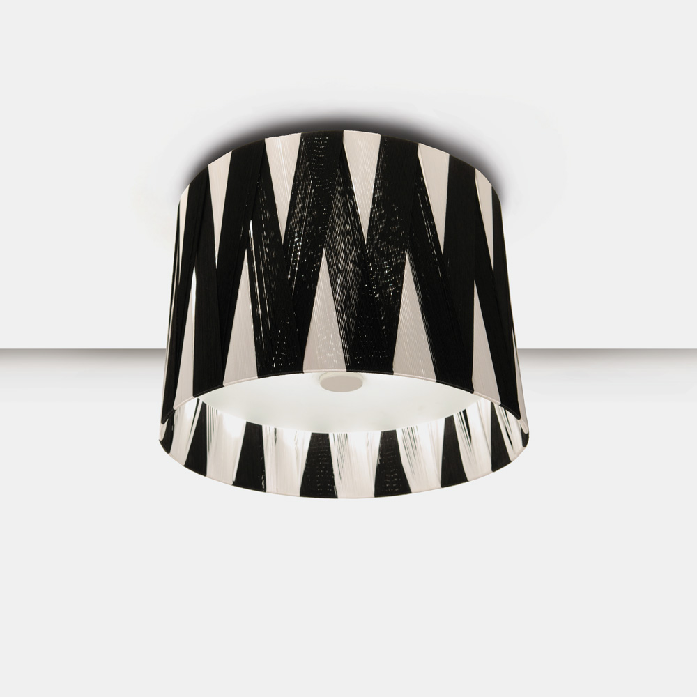Plafom de alumínio. Cúpula de trama de cetim preto e branco. Fechamento de vidro leitoso fosco.