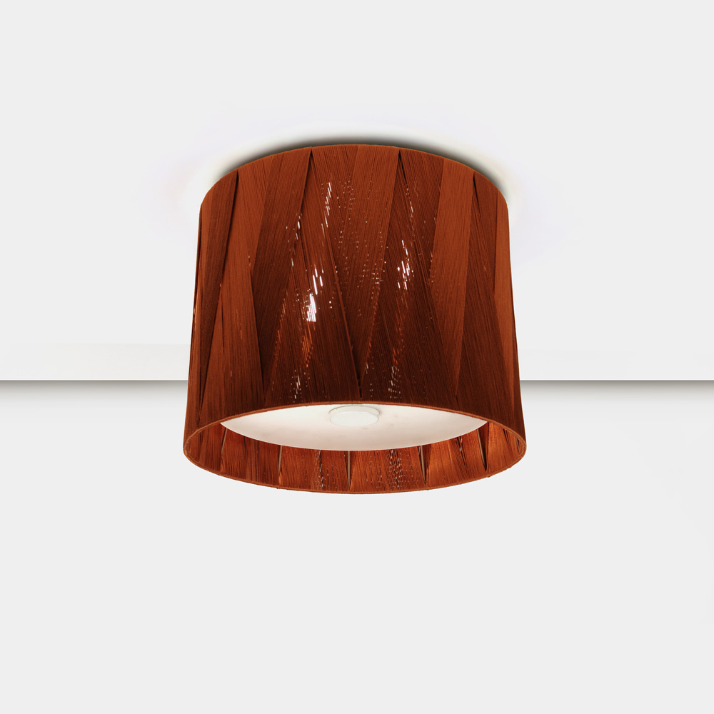 Plafom de alumínio. Cúpula de trama de cetim cobre. Fechamento de vidro leitoso fosco.