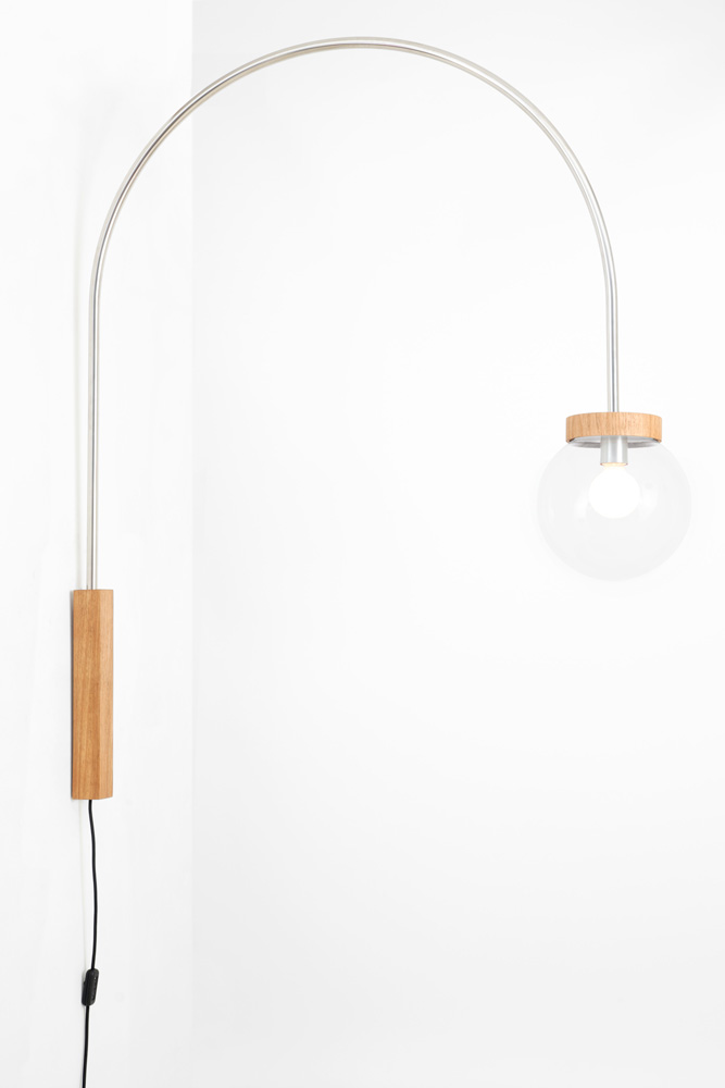 Arandela com haste curva em alumínio ou aço. Canopla e fixação em folha de madeira. Globo de vidro como refletor.