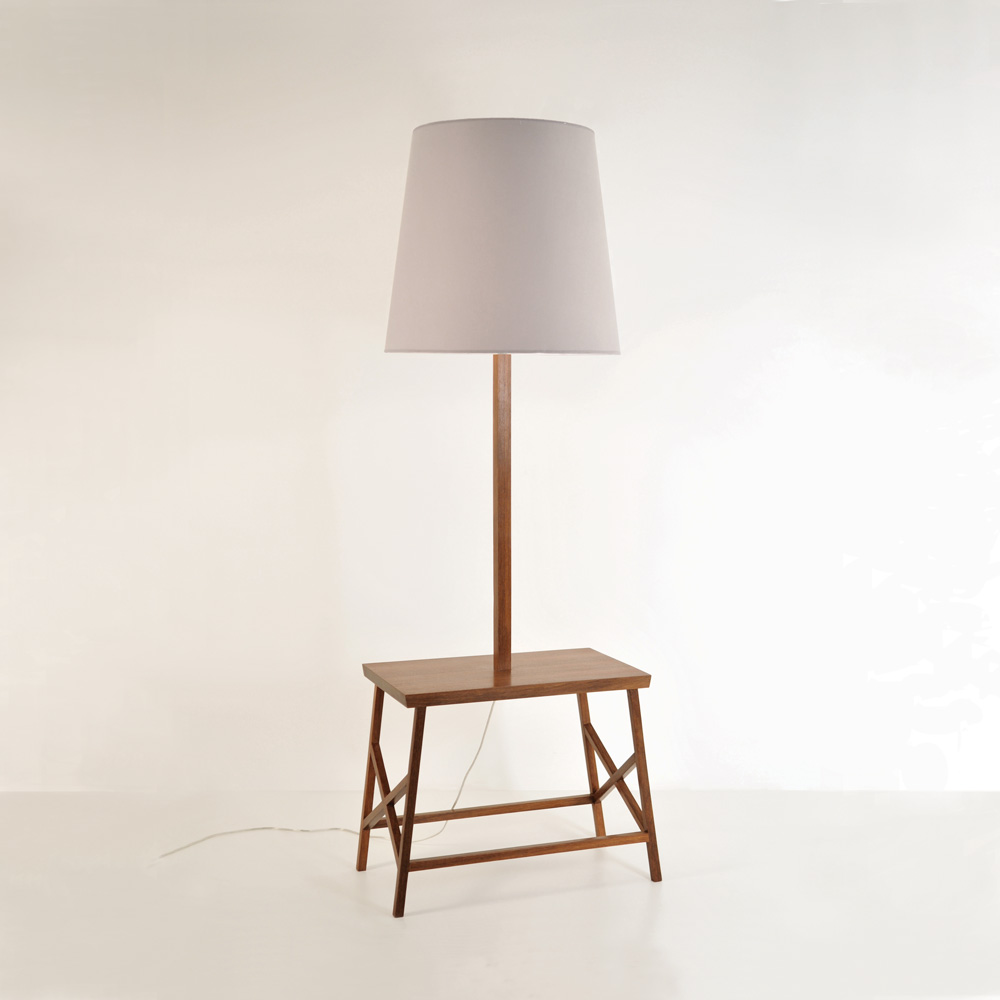 Base de madeira certificada sucupira ou freijó. Cúpula de tecido de algodão liso colorido.