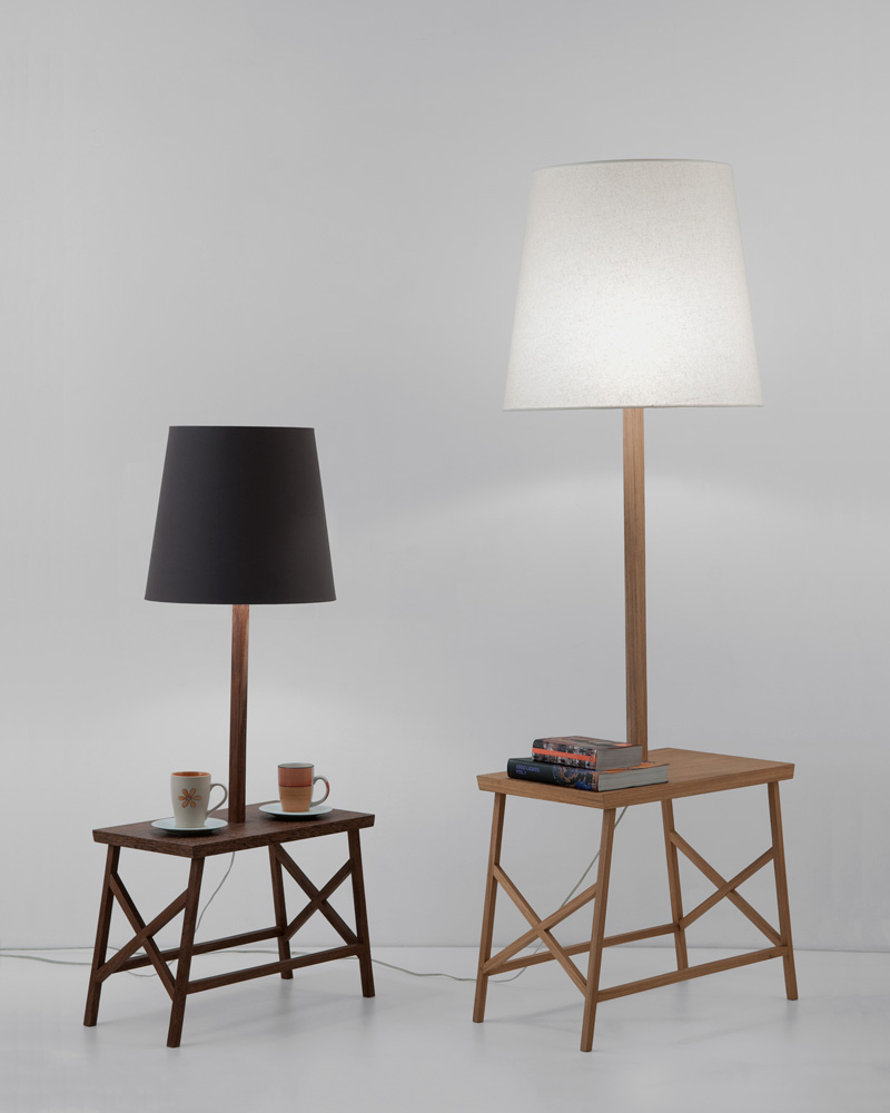 Base de madeira certificada sucupira ou freijó. Cúpula de tecido de algodão liso colorido.
