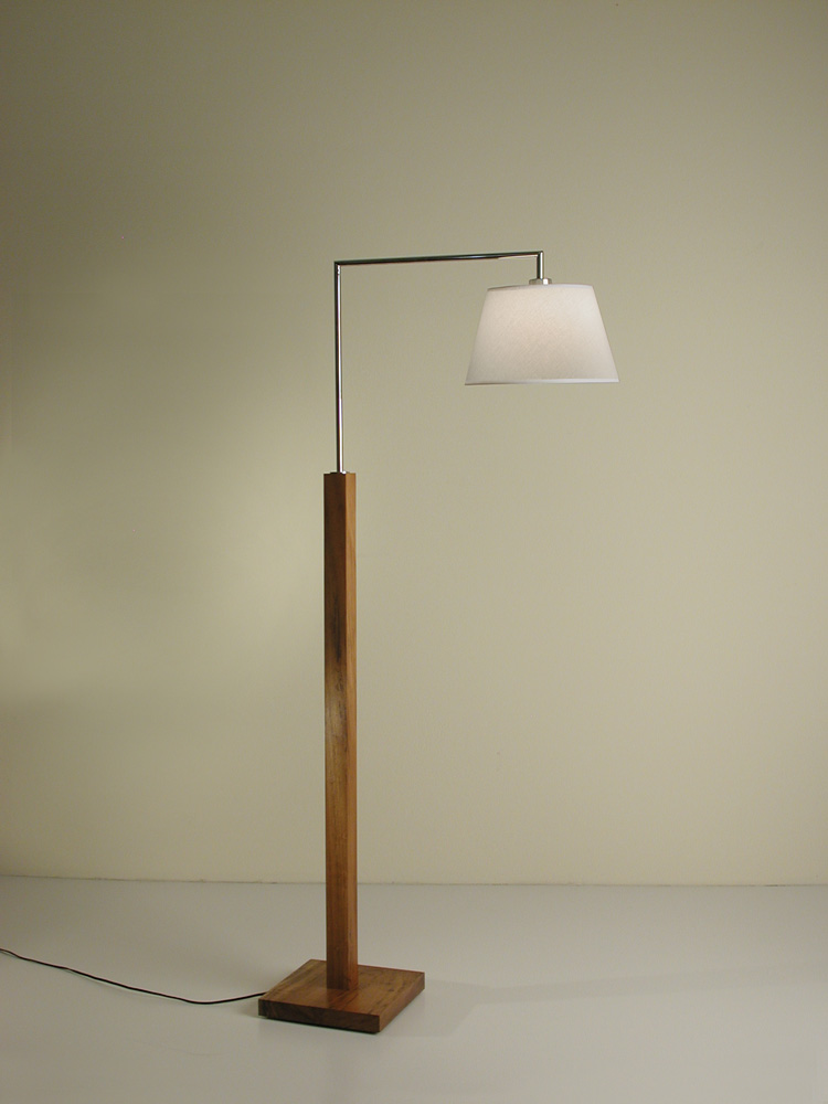 Coluna de madeira mdf com acabamento de imbuia ou freijó e latão cromado. Cúpula de tecido de algodão liso disponível em diversas cores.