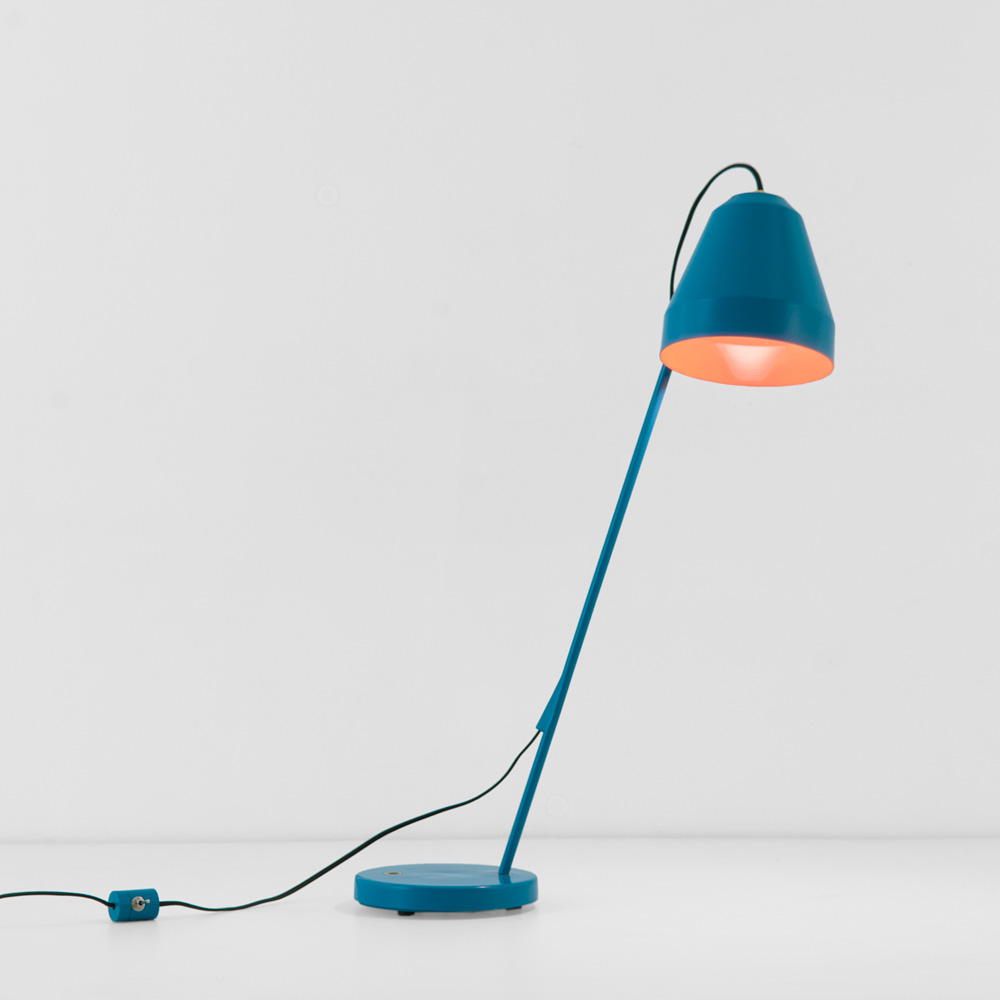 Abajur regulável de alumínio colorido com base e refletor independentes permitindo diversas funções.