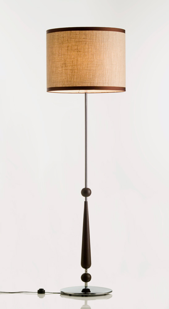Coluna de latão cromado e madeira tipo pinus elliotti de reflorestamento torneada escurecida. Cúpula de linhão com detalhe de gorgurão marrom.