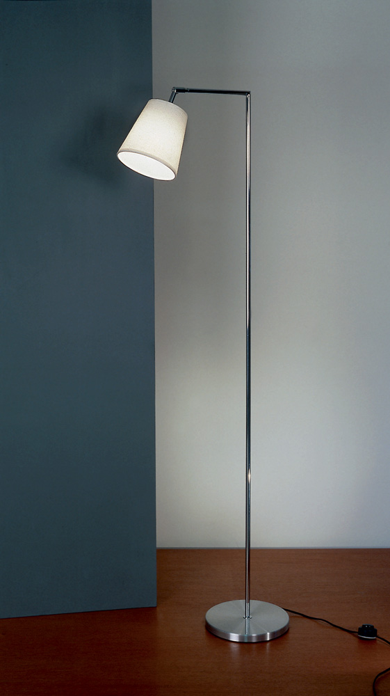 Coluna articulável. Haste de latão cromado e base de alumínio escovado. Cúpula de tecido de algodão.
