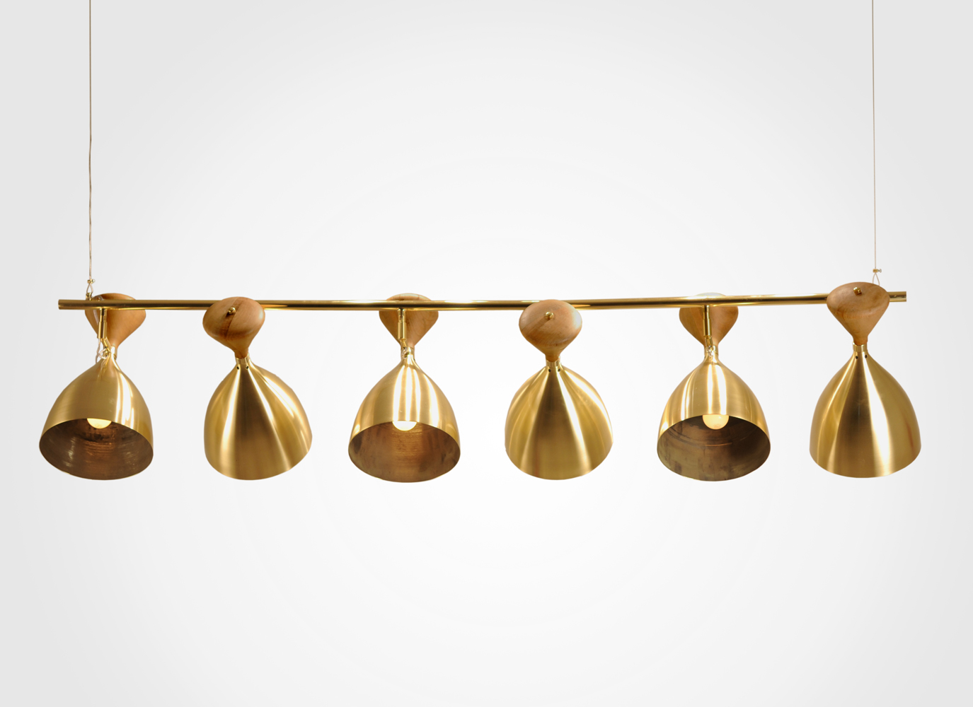 Estrutura de latão escovado e latão polido. Detalhe do refletor de madeira certificada canela.