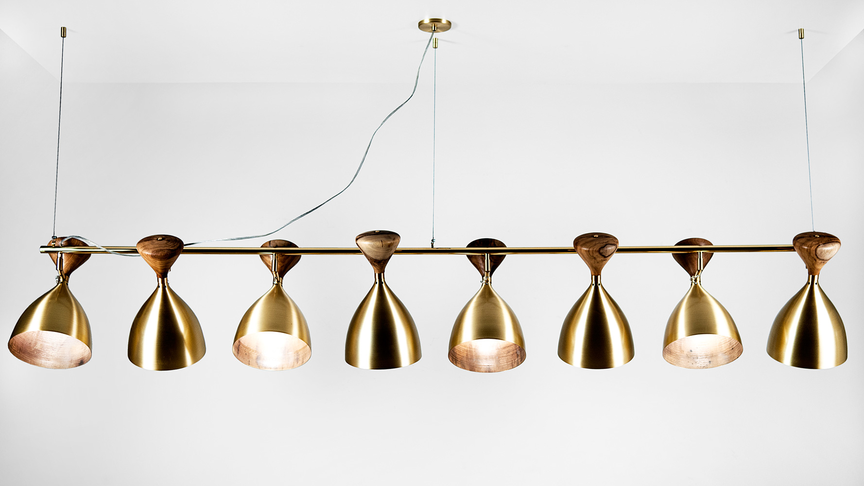 Estrutura de latão escovado e latão polido. Detalhe do refletor de madeira certificada canela.