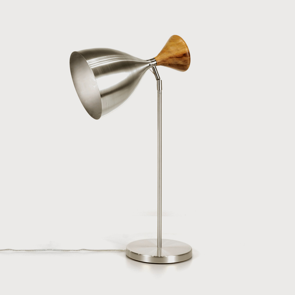 Refletor e base em alumínio escovado o e haste em alumínio polido. Detalhe do refletor de madeira certificada canela.