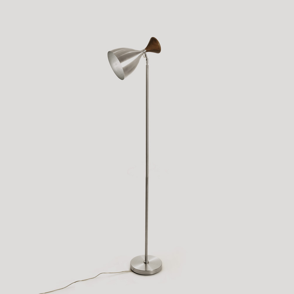 Refletor e base em alumínio escovado e haste em alumínio polido. Detalhe do refletor de madeira certificada canela.