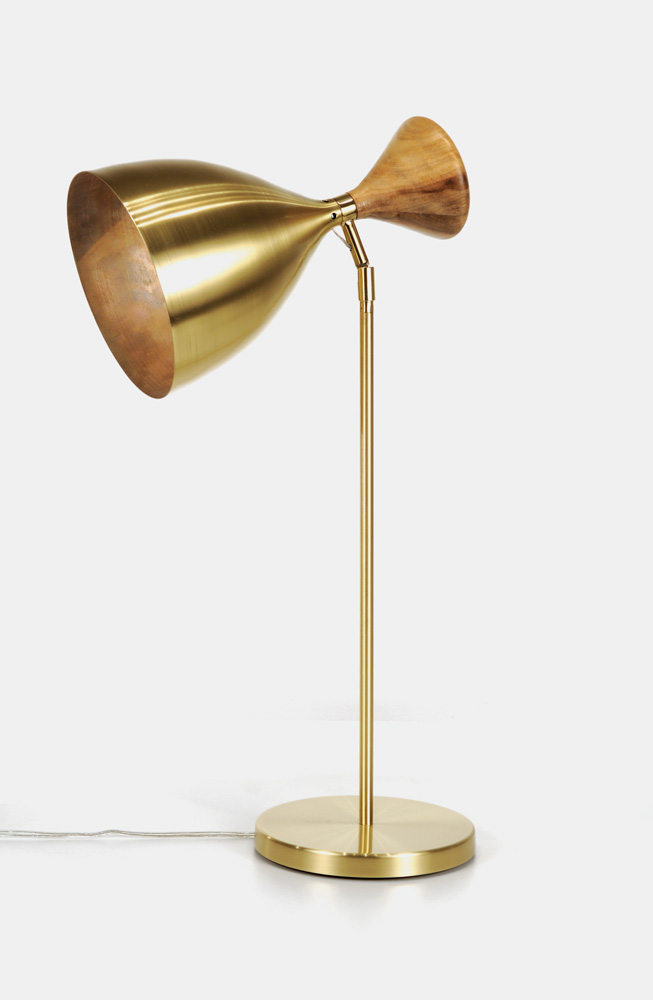 A601 - Refletor e base em latão escovado e haste em latão polido. Detalhe do refletor de madeira certificada canela.