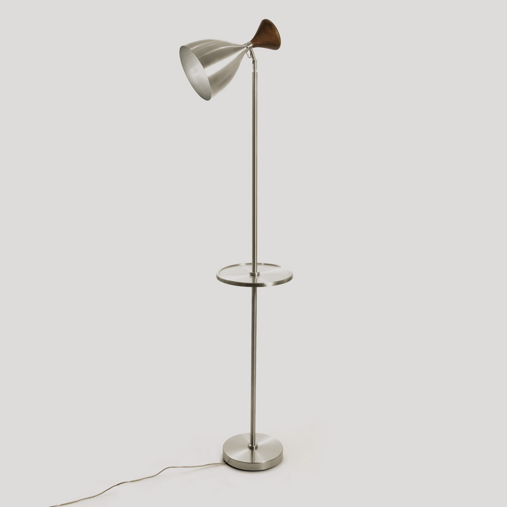 Coluna articulável com refletor, base e mesa em alumínio escovado e haste em alumínio polido. Detalhe do refletor de madeira certificada canela.