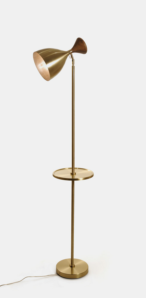 Coluna articulável com refletor, base e mesa em latão escovado e haste em latão polido. Detalhe do refletor de madeira certificada canela.