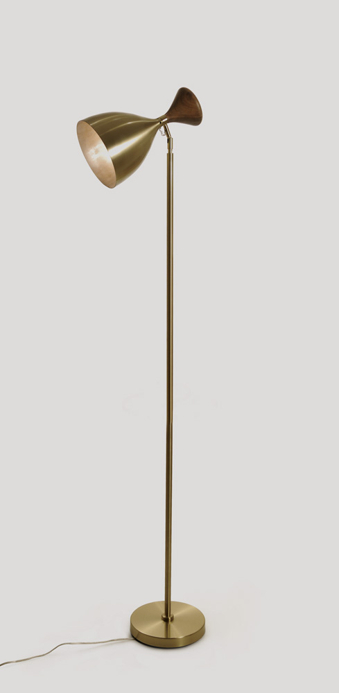 Refletor e base em latão escovado e haste em latão polido. Detalhe do refletor de madeira certificada canela.