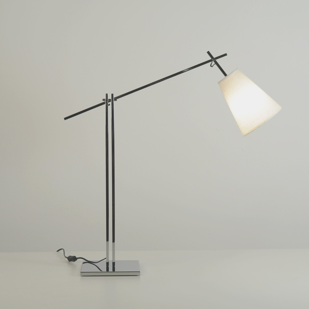 Abajur de latão envelhecido ou cromado com braço fixo e cúpula articulável. Cúpula em algodão.