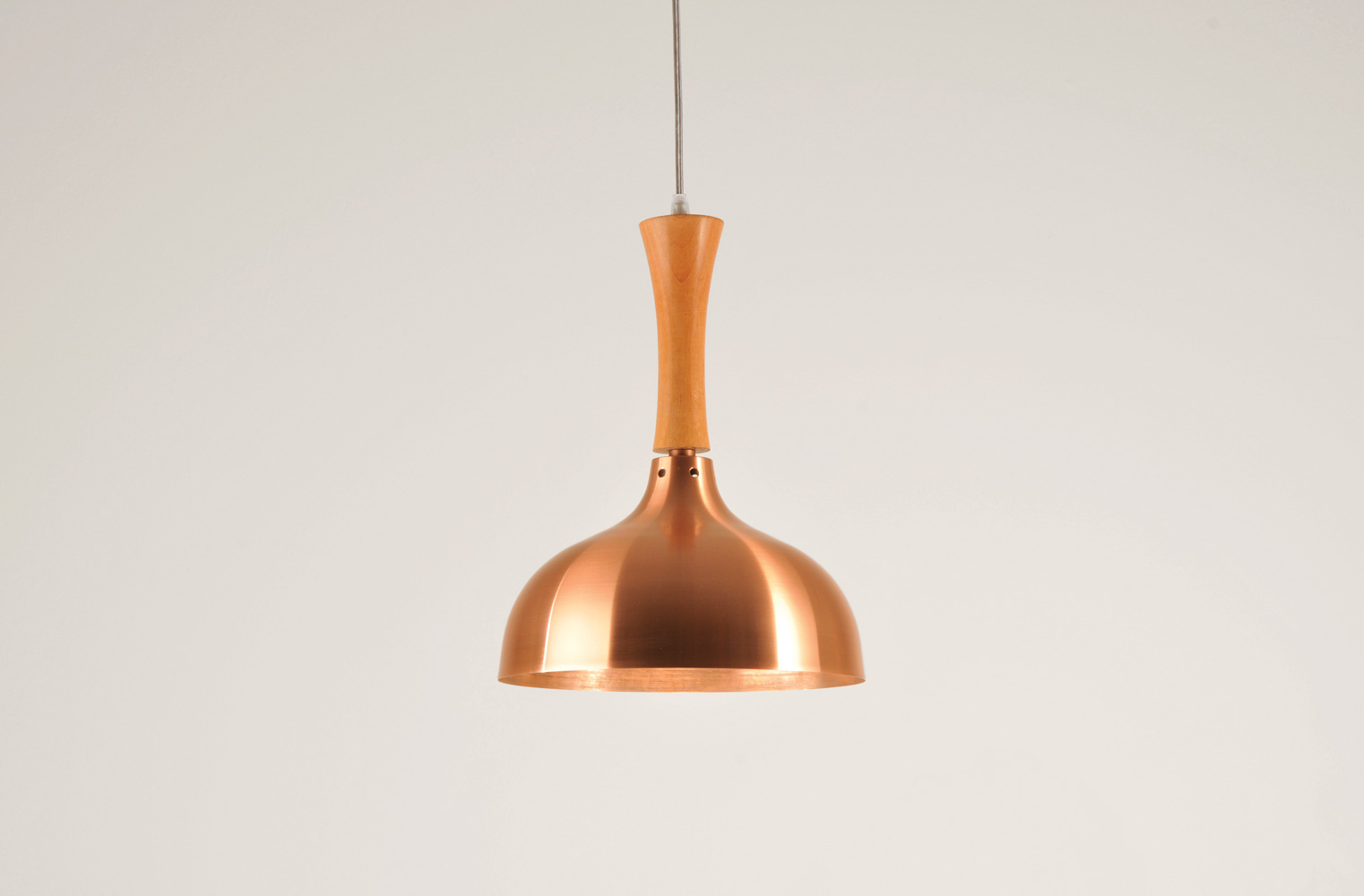 Pendente de cobre escovado e madeira certificada (consultar tipo de madeira disponível). Interno acabamento natural.