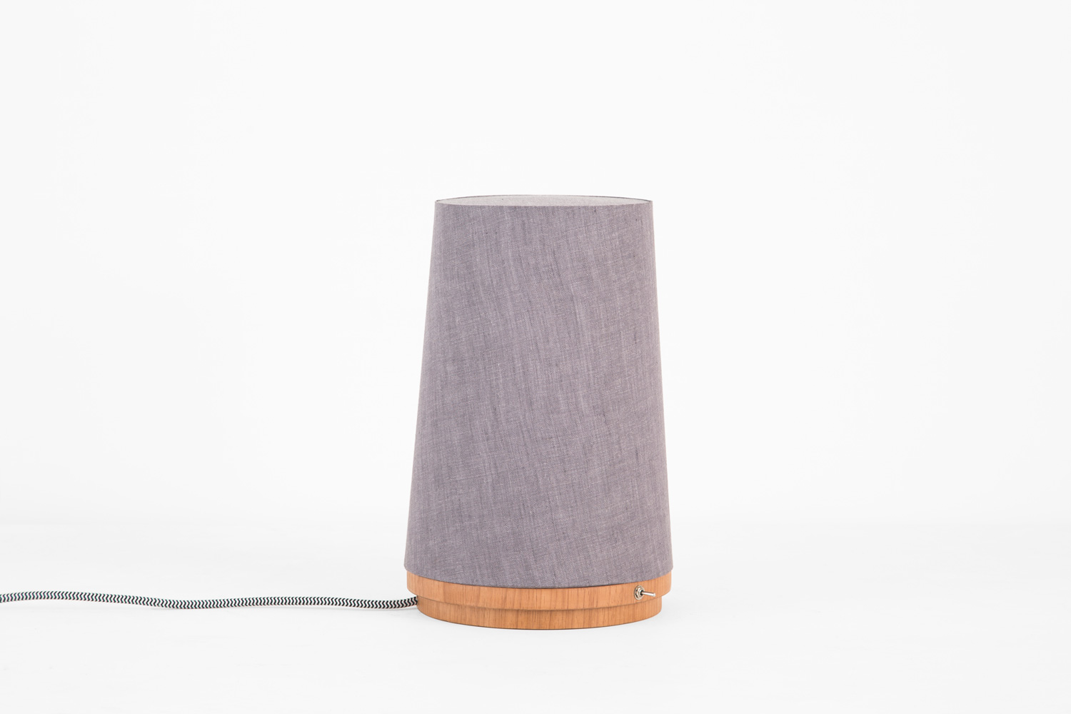 Abajur que combina linho e madeira Canela, Imbuia, Curupixá ou Jequitibá. Cordão de força de tecido em cores e interruptor integrado na base.
