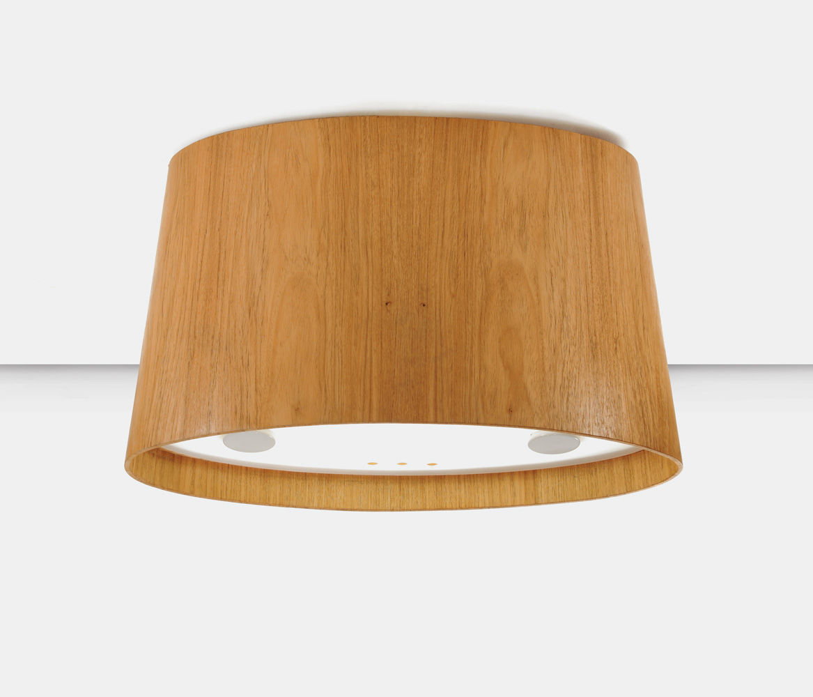 Plafom de madeira certificada freijó com estrutura de alumínio off white e fechamento de acrílico leitoso fosco.