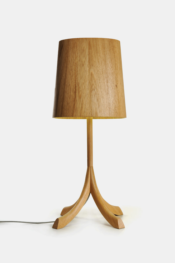 Abajur de madeira certificada freijó, com cordão de força de tecido colorido.