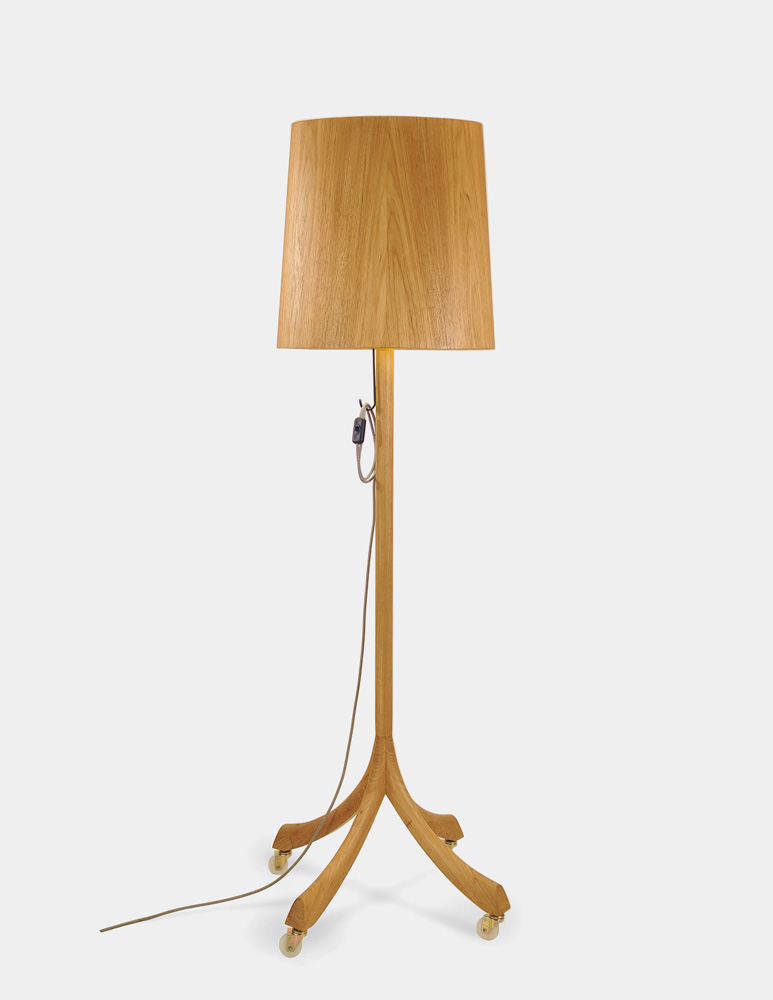 Coluna de madeira certificada freijó com rodízios. Cordão de força de tecido com gancho para fixação.