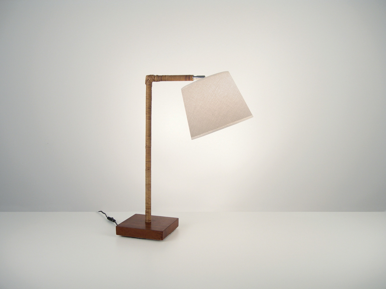 Abajur articulável com base de madeira com acabamento de imbuia e haste com acabamento em junco.