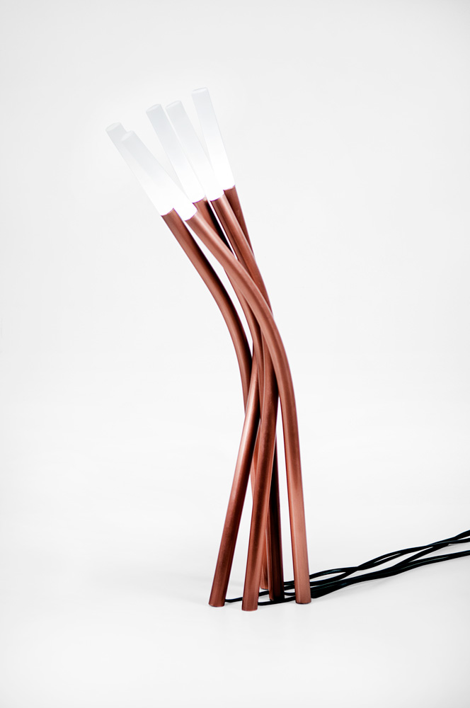 Inspirada no movimento fluído e delicado da grama no vento, é composta por cinco tubos de cobre curvados manualmente e bastões de acrílico iluminado por leds, gerando um tipo de luz leve e difusa.