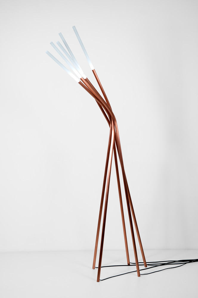 Inspirada no movimento fluído e delicado da grama no vento, é composta por cinco tubos de cobre curvados manualmente e bastões de acrílico iluminado por leds, gerando um tipo de luz leve e difusa.