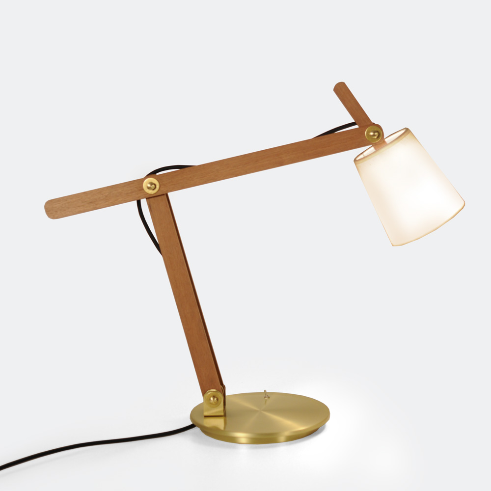 Abajur de leitura articulável, em madeira cedrinho ou freijó certificadas. Cúpula de algodão e base de latão escovado. Cordão de tecido.