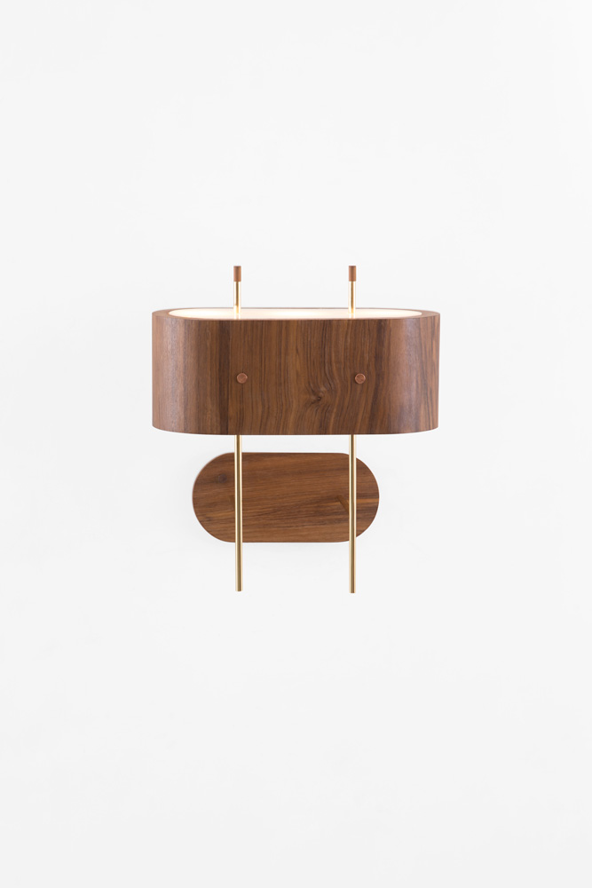 Arandela de madeira Imbuia ou Louro Preto. Estrutura metálica em latão polido, cobre polido ou latão cromado. Interruptor embutido na canopla.