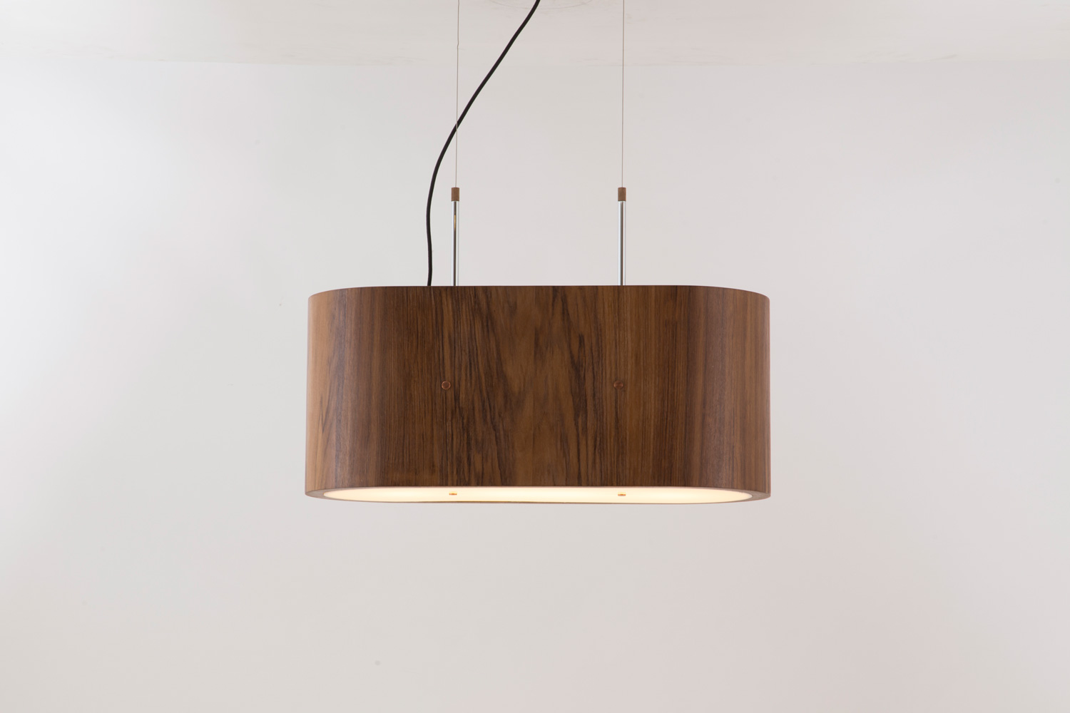 Pendente de madeira Imbuia ou Louro Preto. Estrutura metálica em latão polido, cobre polido ou latão cromado.