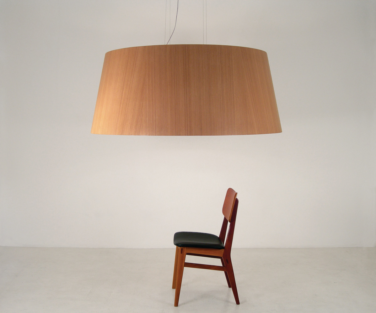 Pendente de madeira folhada. Fechamento inferior de acrílico.