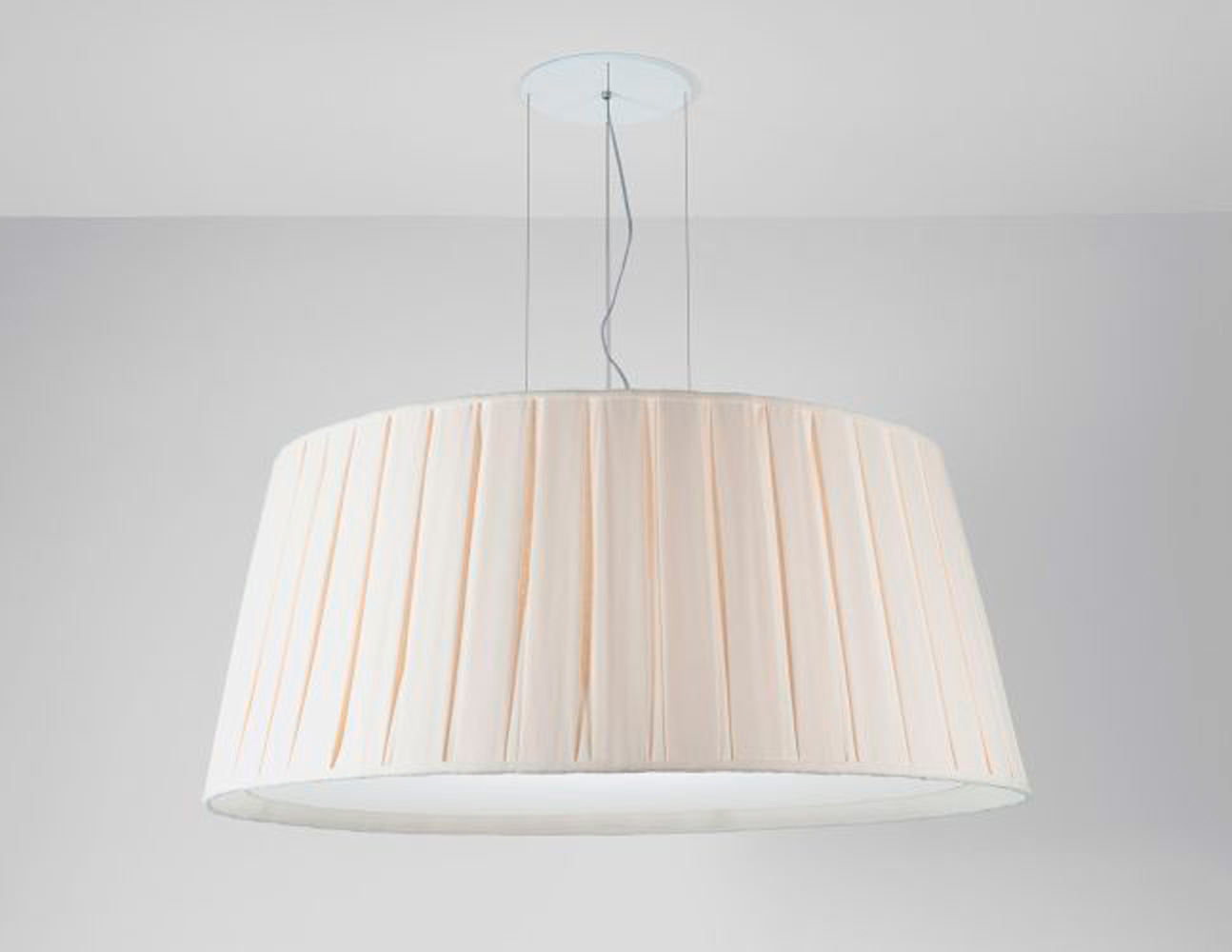 Pendente com cúpula de tecido branco, preto, cru ou vermelho com prega macho. Fechamento inferior de policarbonato.