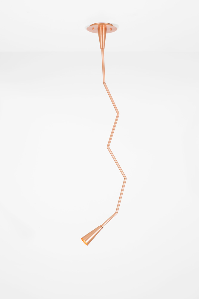 Pendente articulável composto por tubos conectados por esferas que permitem sua mobilidade.