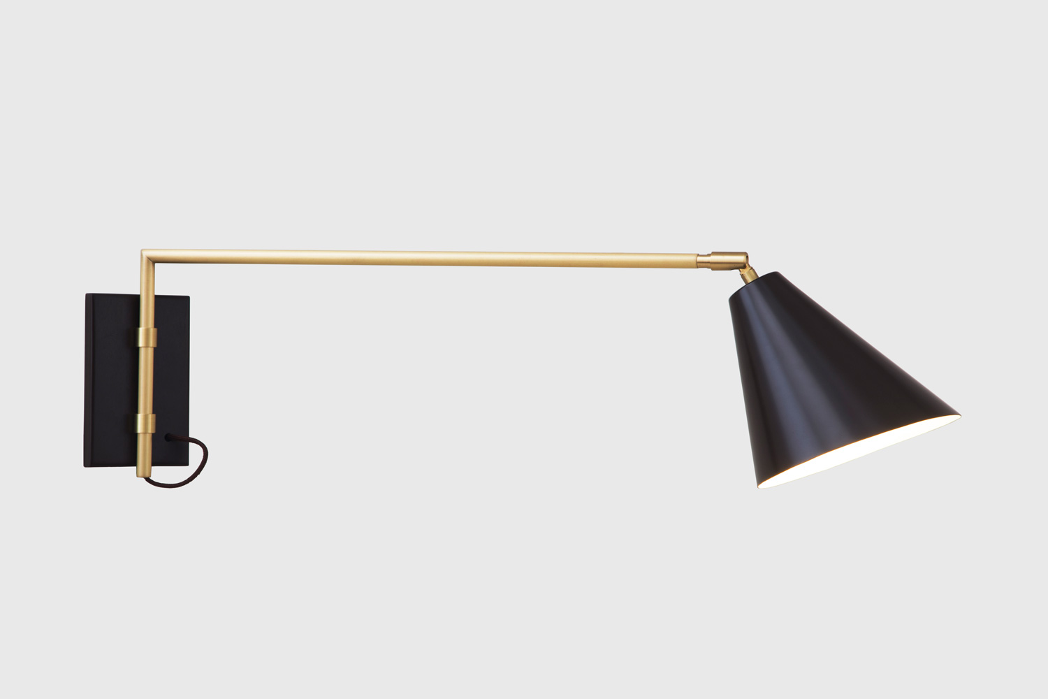 Arandela articulável com haste de latão maciço lixado. Refletor e canopla em alumínio colorido disponivel nas cores: café, azul marinho, azul lagoa, verde, cinza queimado e grafite. Detalhes das hastes e dos anéis de fixação em latão, assegurando assim continuidade e fluidez dos materiais. Fino cordão de tecido em várias cores.