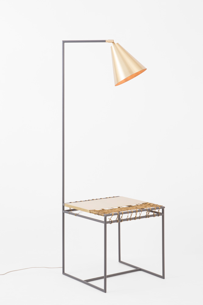 Coluna com mesa confeccionada com fios de latão reaproveitados e chapa de latão escovado. Refletor escovado externo e natural interno, estrutura colorida e cordão de tecido em cores.