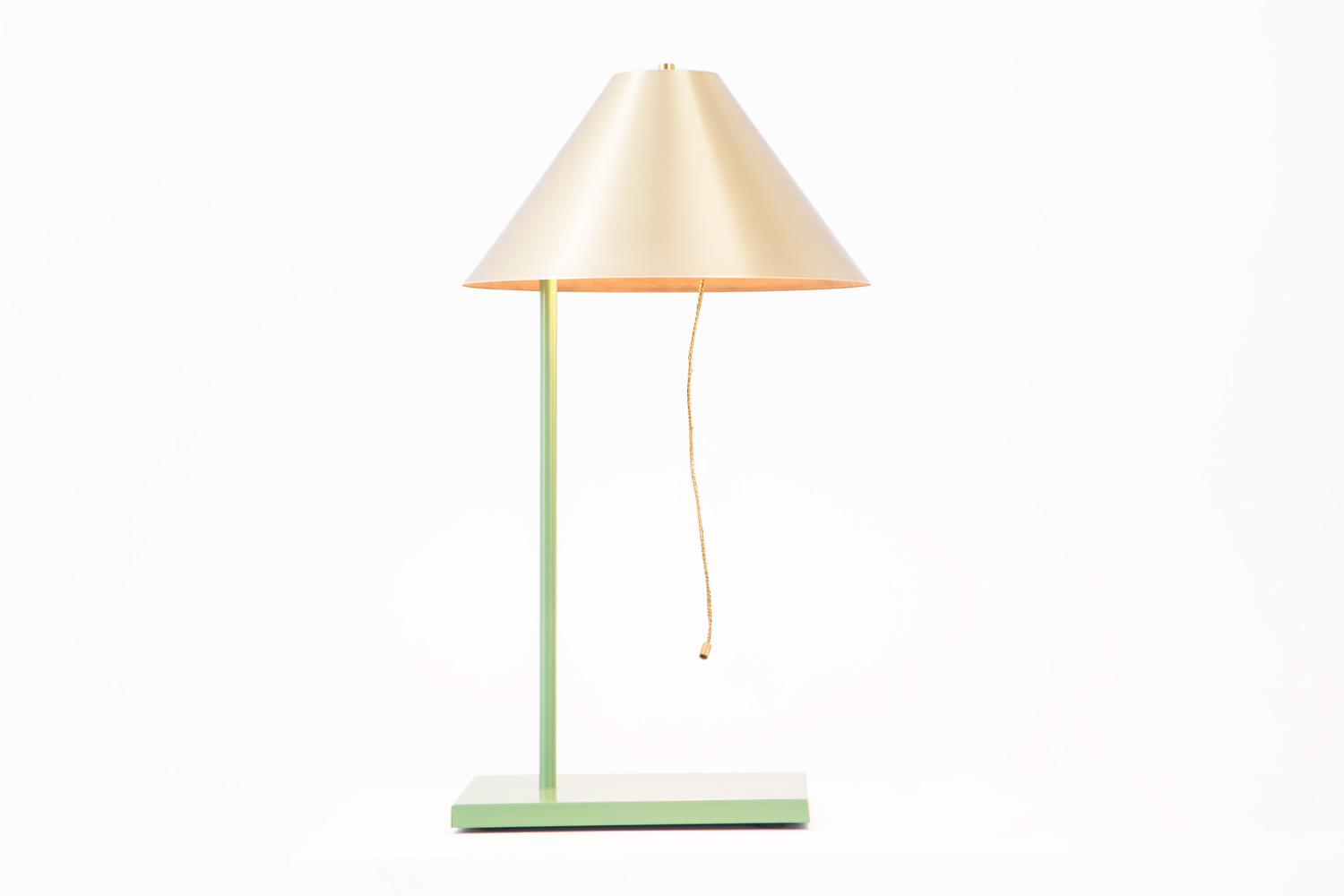 Abajur com refletor de latão escovado externo e natural interno, estrutura colorida, interruptor especial trançado de fios de latão reaproveitados e cordão de tecido em cores