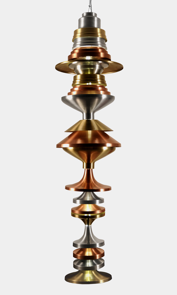 Homenagem ao fundador da empresa, Sr. Walter Bertolucci. É uma combinação de refletores repuxados manualmente em cobre, latão e alumínio, produzidos a partir de modelos de bases de abajur de nosso acervo.