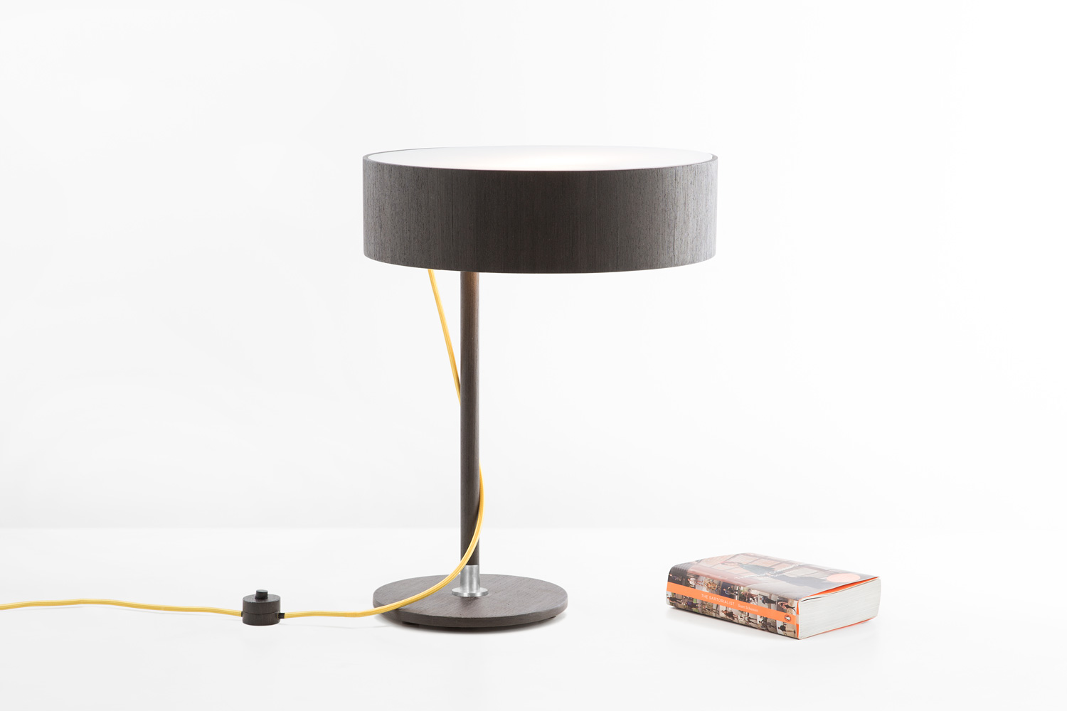 Estrutura em madeira com acabamento de folha de madeira linheiro cinza claro ou cinza escuro. Cúpula rotacionável com fechamento em policarbonato. Cordão de força de tecido colorido com interruptor especial em madeira.