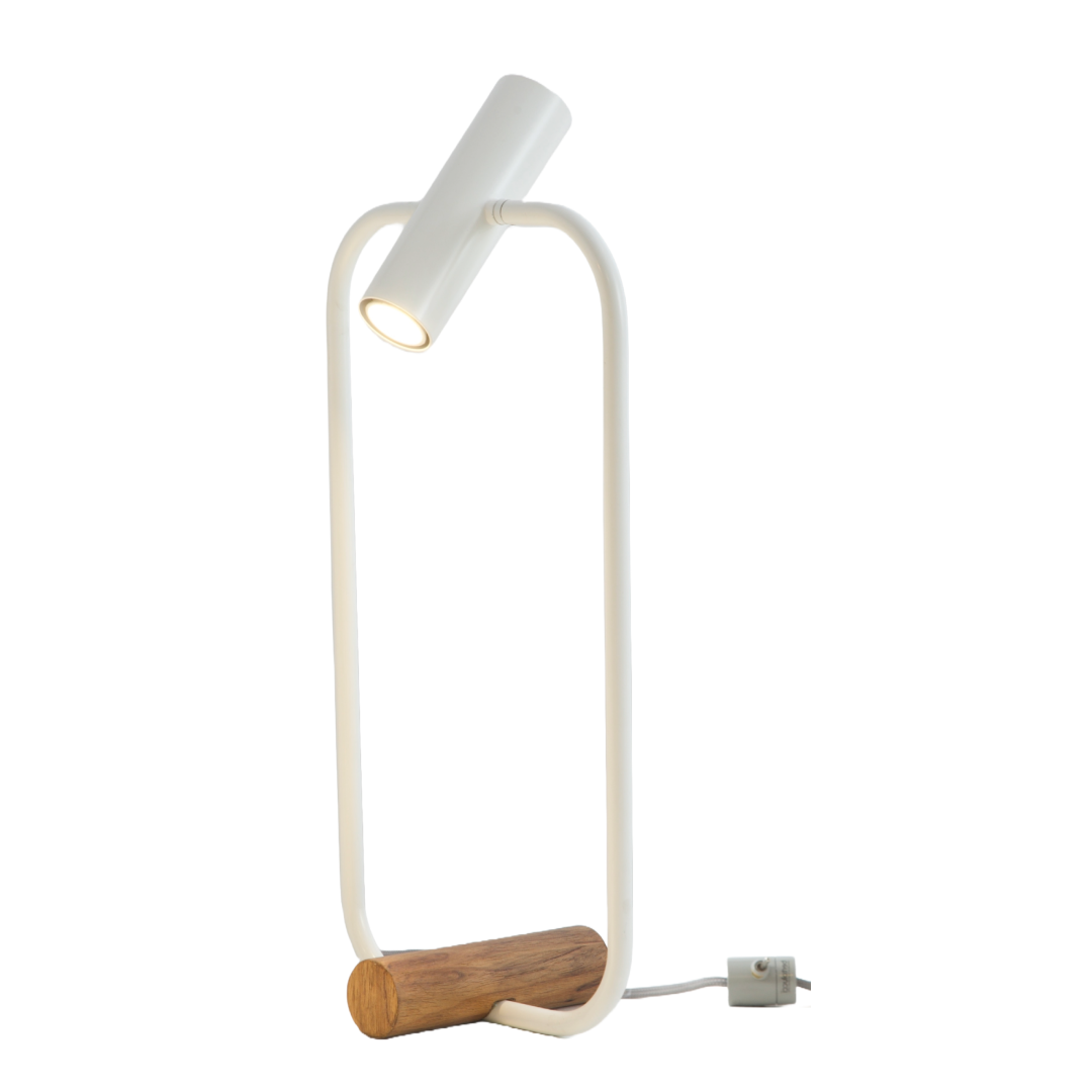 Abajur com base de madeira e estrutura de metal.
