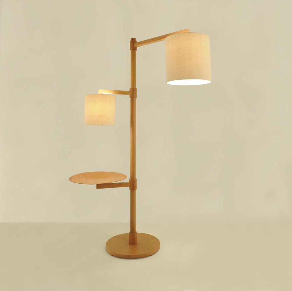 Coluna com estrutura modular articulável de freijó, cúpulas de linho ou algodão e prato de madeira maciça torneada.