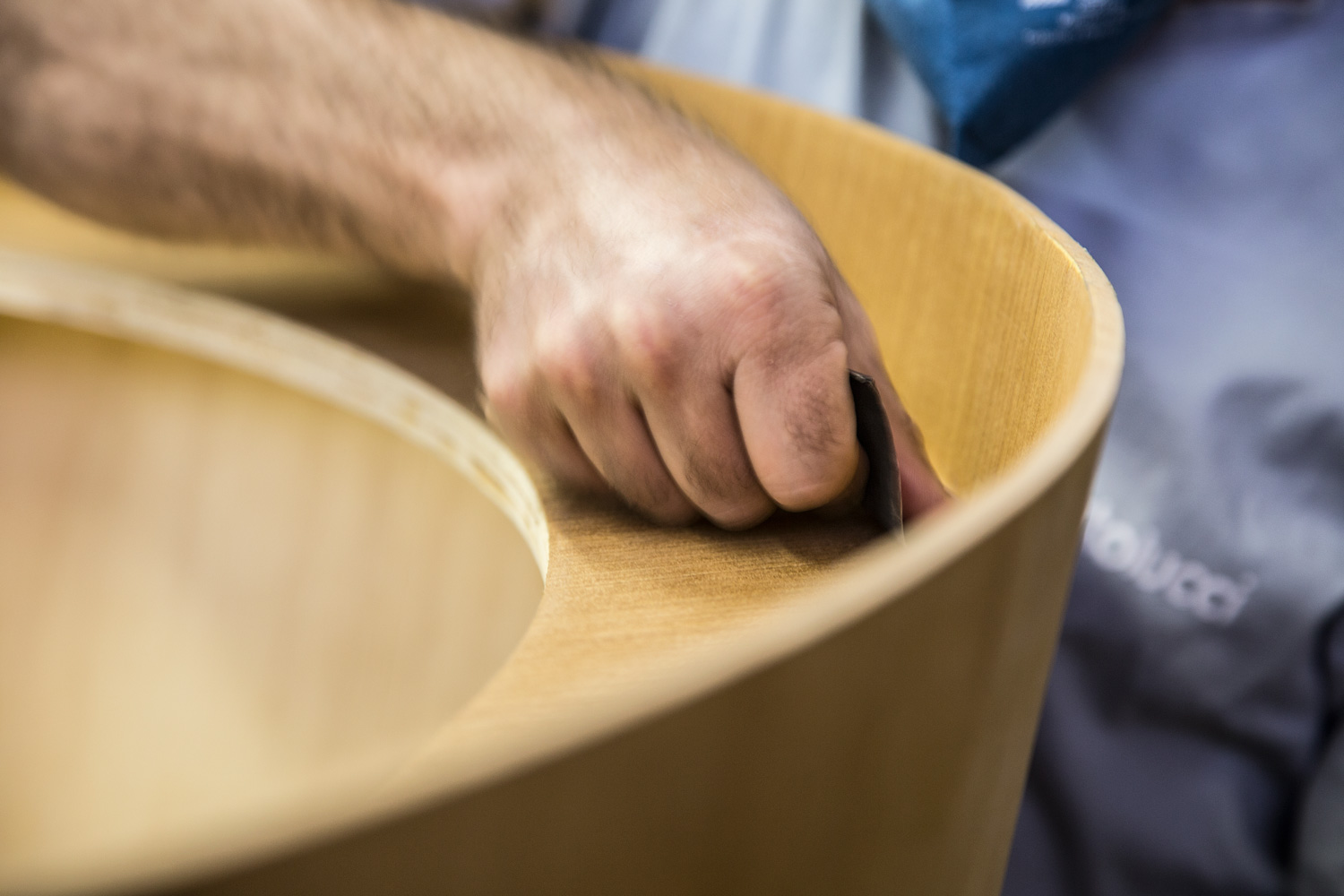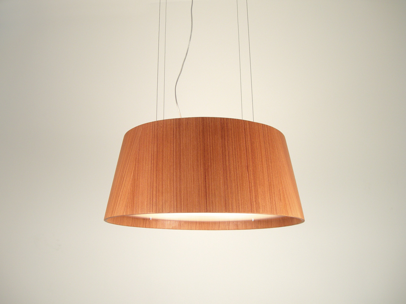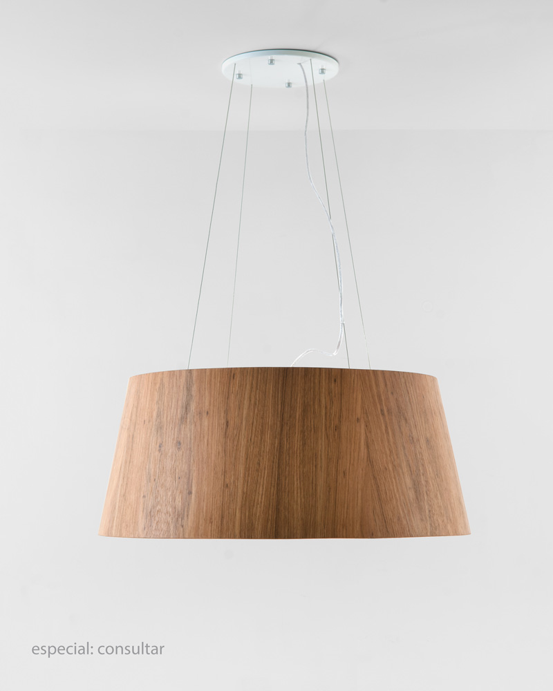 Pendente de madeira folhada. Fechamento inferior de acrílico.