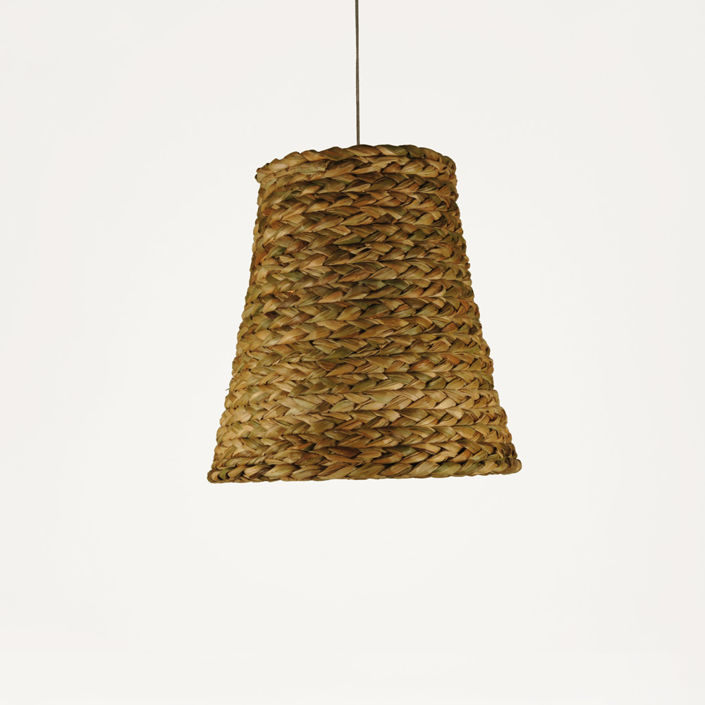 Originária da América do Sul, a taboa é uma planta aquática depuradora de águas e adaptável em vários ambientes. Sua fibra é longa e resistente, o que permite diferentes formas de manuseio, como esse sofisticado pendente.