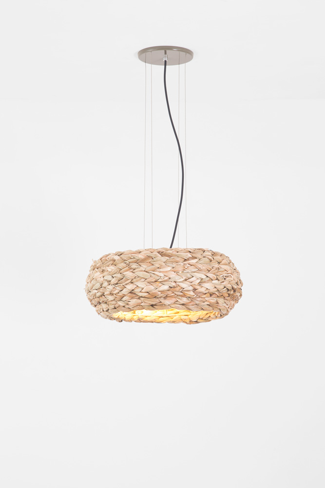 Tifa é composta por dois pendentes e um abajur. Os produtos são confeccionados com fibras de taboa pelas artesãs da ONG Orientavida, conhecida pelo seu trabalho social no Vale do Paraíba, São Paulo. Encontrada em abundância região, a taboa é trançada tomando como inspiração os arreios de cavalos rústicos do século XIX.