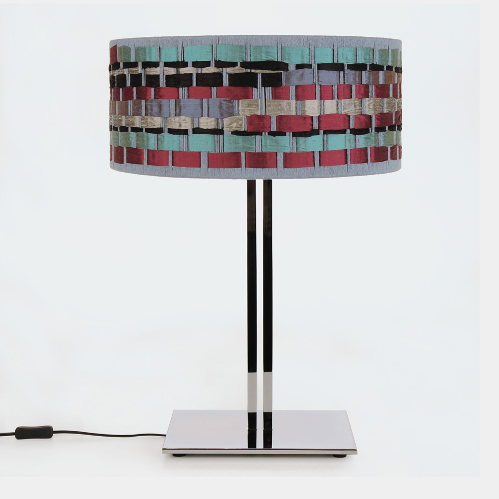 Abajur com base de latão cromado e cúpula de barbante de algodão e fitas de sedas.