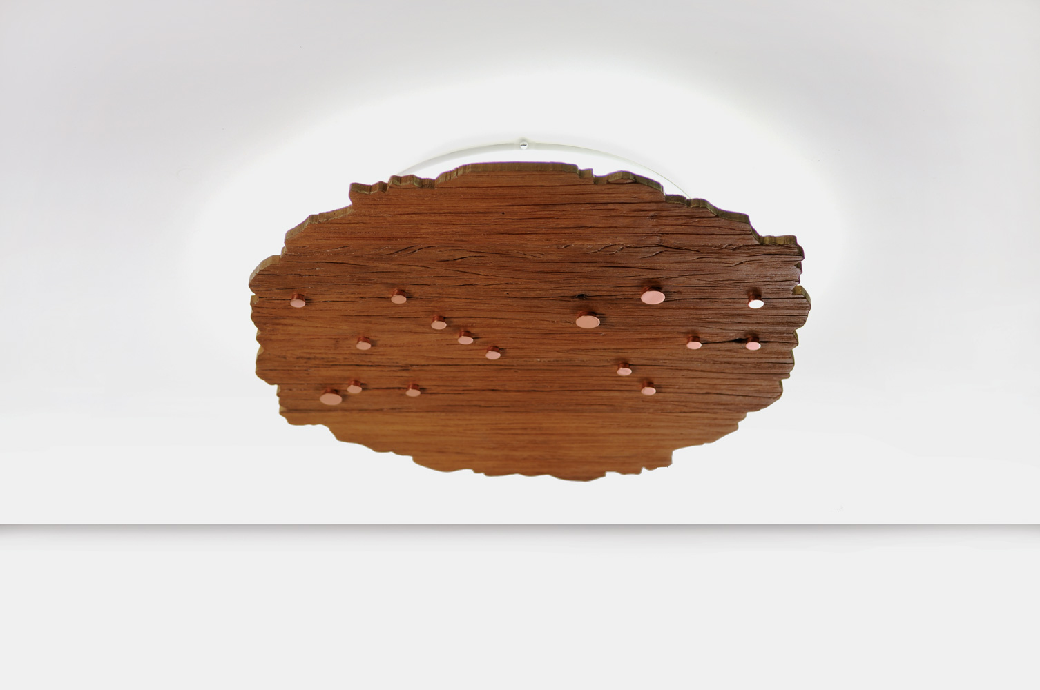 Plafom de madeira de demolição Peroba Rosa com detalhes em cobre polido. Estrutura de alumínio branco e difusor de policarbonato.