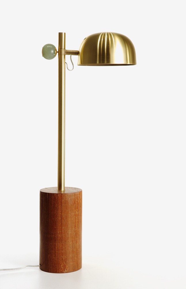 Releitura dos tradicionais abajures utilizados antigamente em bibliotecas. Revitalizado, ganhou visual mais leve com formas geométricas suavizadas por curvas.