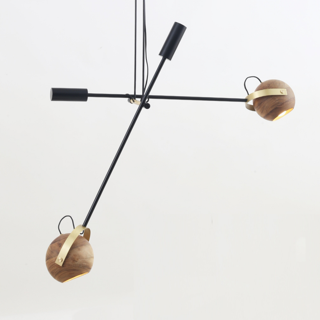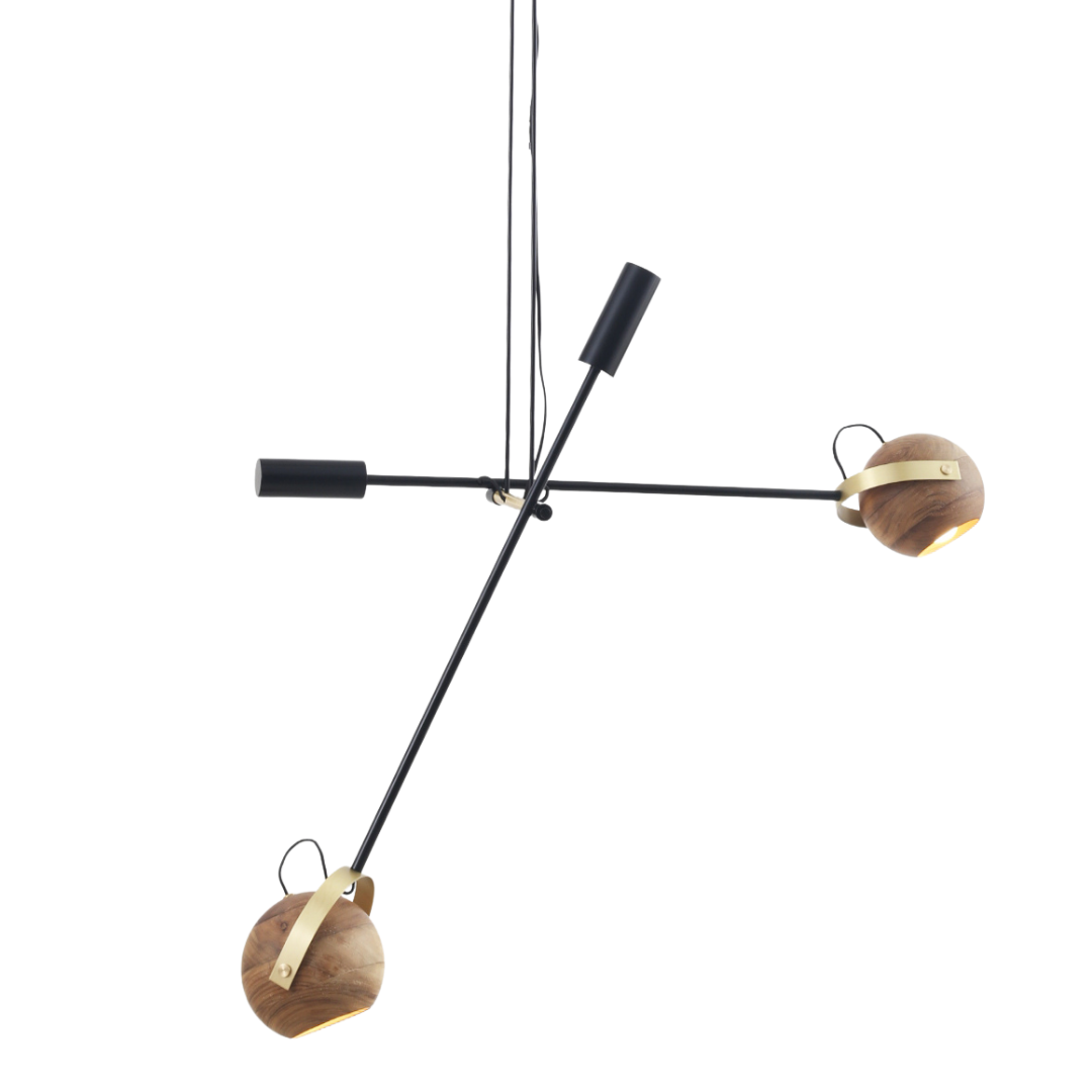 Pendente com dois refletores esféricos torneados em madeira canela. Hastes de alumínio com pintura preta. Detalhes em latão.