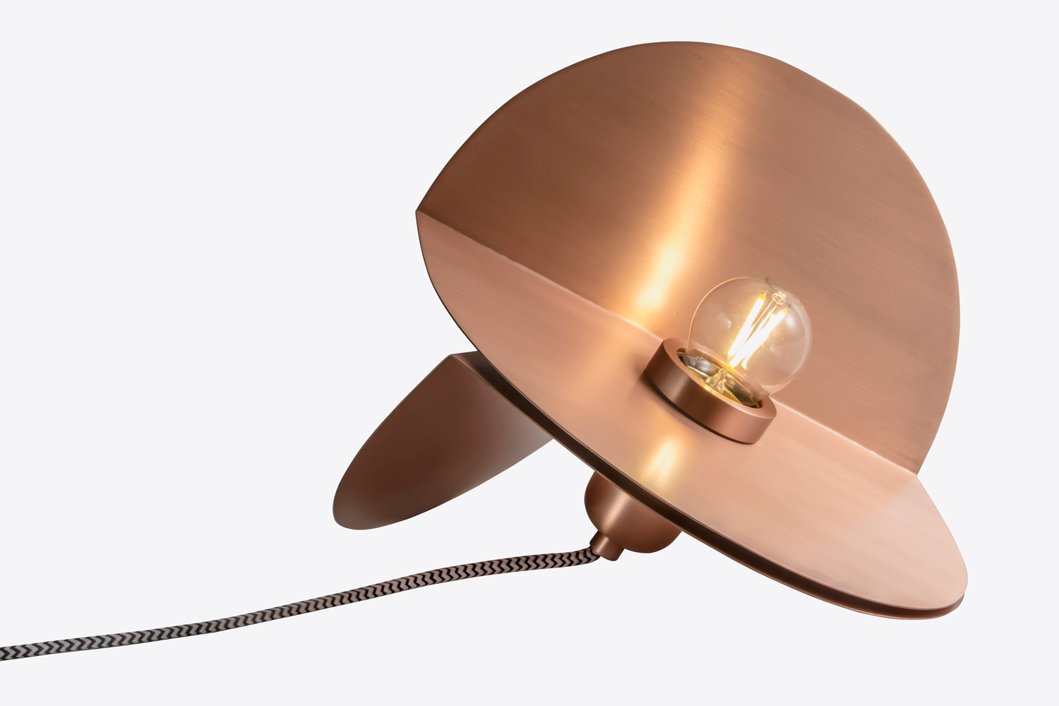 Luminária de mesa composta de duas chapas de cobre dobradas e articuladas entre si. Acabamento em cobre escovado manualmente e envernizado. Interruptor especial em cobre escovado. Cordão de força de tecido fino preto e branco.
